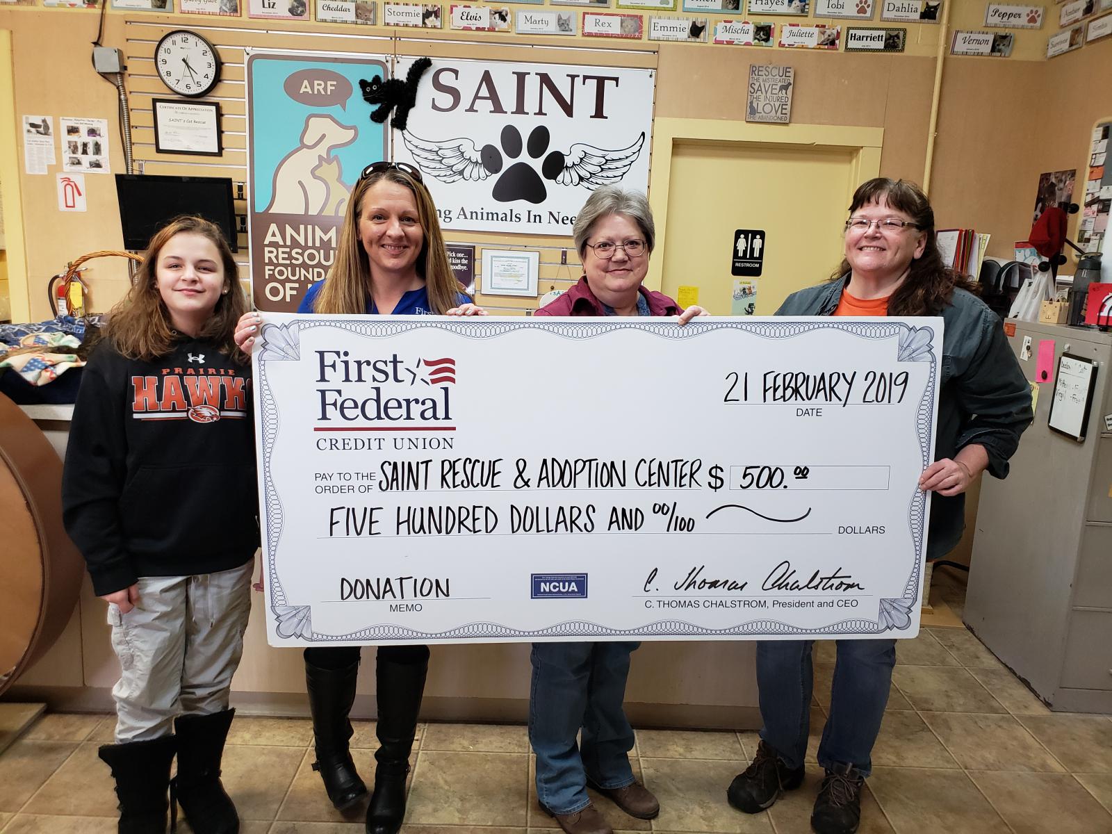 As the recipient of the 2018 Volunteer Hours Award, Tracy was awarded $500 to donate to her charity of choice. Tracy and her daughter Ella, presented Peggy Stotser and Lisa Geyer from SAINT Cat Adoption Center a check for $500!